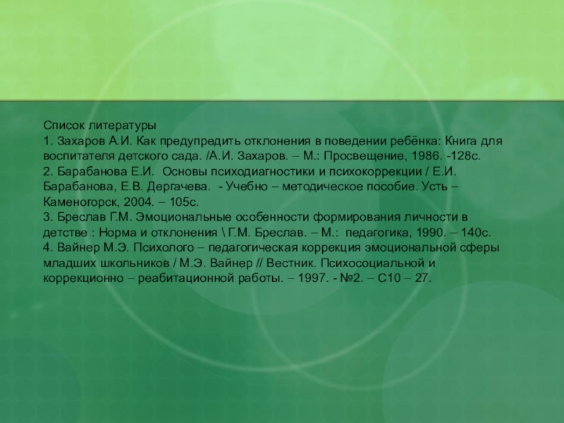 3. Бреслав Г.М. Эмоциональные особенности формирования личности в детстве : Норма и отклонения \ Г.М. Бреслав. – М.: педагогика, 1990. – 140с.