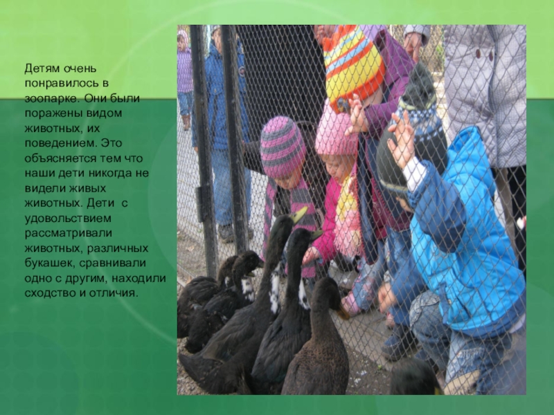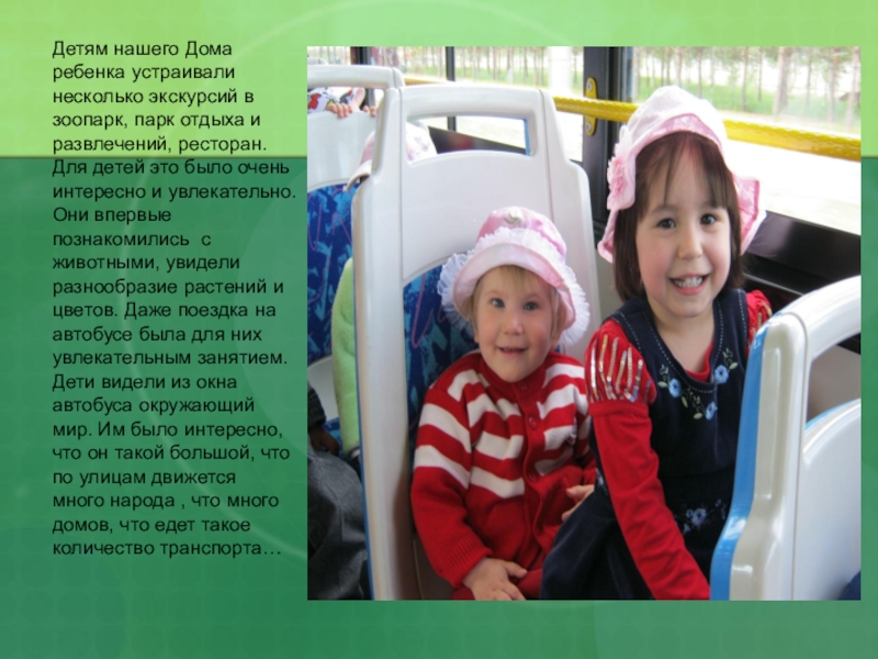 Слайд 20Детям нашего Дома ребенка устраивали несколько экскурсий в зоопарк, парк отдыха