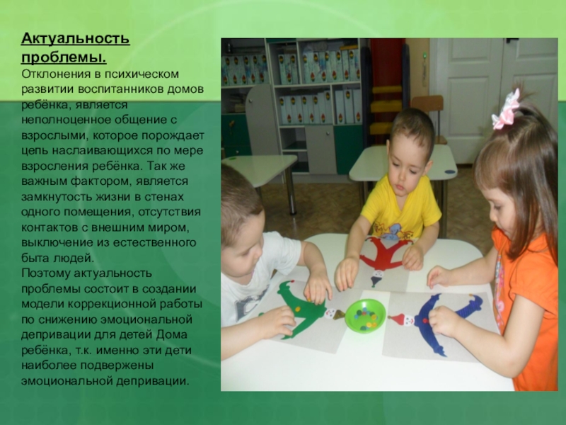 Поэтому актуальность проблемы состоит в создании модели коррекционной работы по снижению эмоциональной депривации для детей Дома ребёнка, т.к. именно эти дети наиболее подвержены эмоциональной депривации.