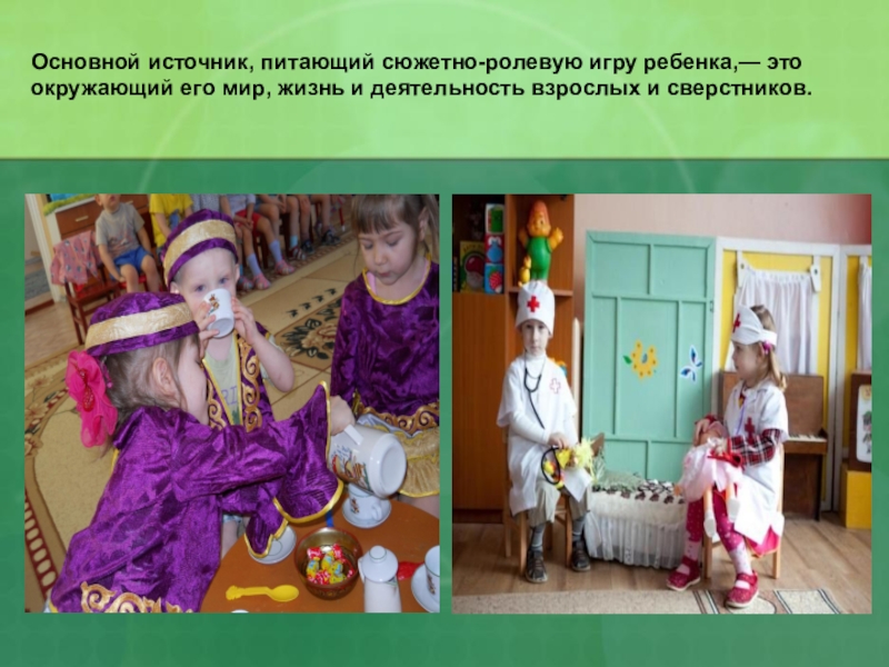 Слайд 10Основной источник, питающий сюжетно-ролевую игру ребенка,— это окружающий его мир, жизнь