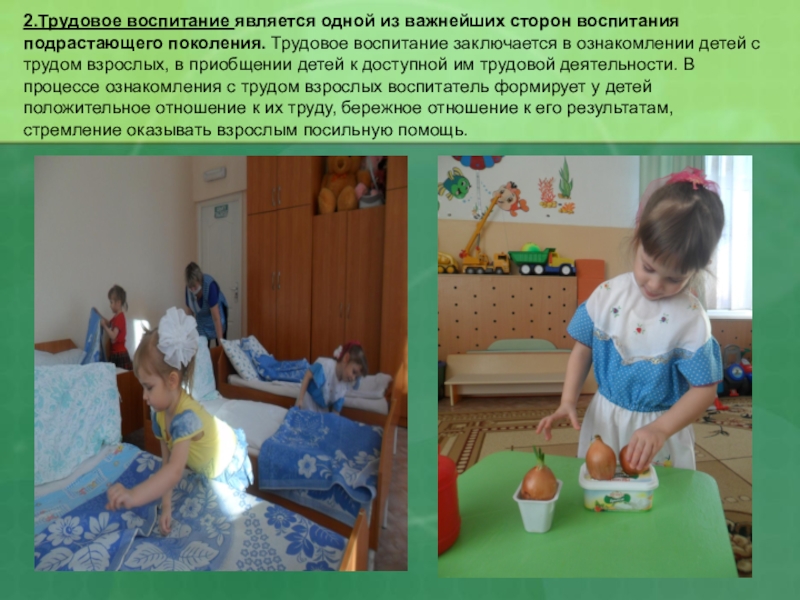 Слайд 112.Трудовое воспитание является одной из важнейших сторон воспитания подрастающего поколения. Трудовое
