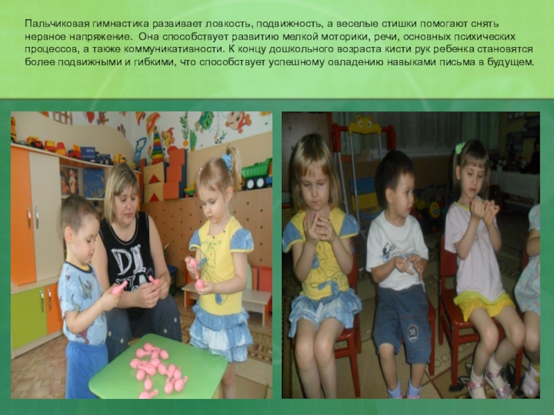 Слайд 8Пальчиковая гимнастика развивает ловкость, подвижность, а веселые стишки помогают снять нервное