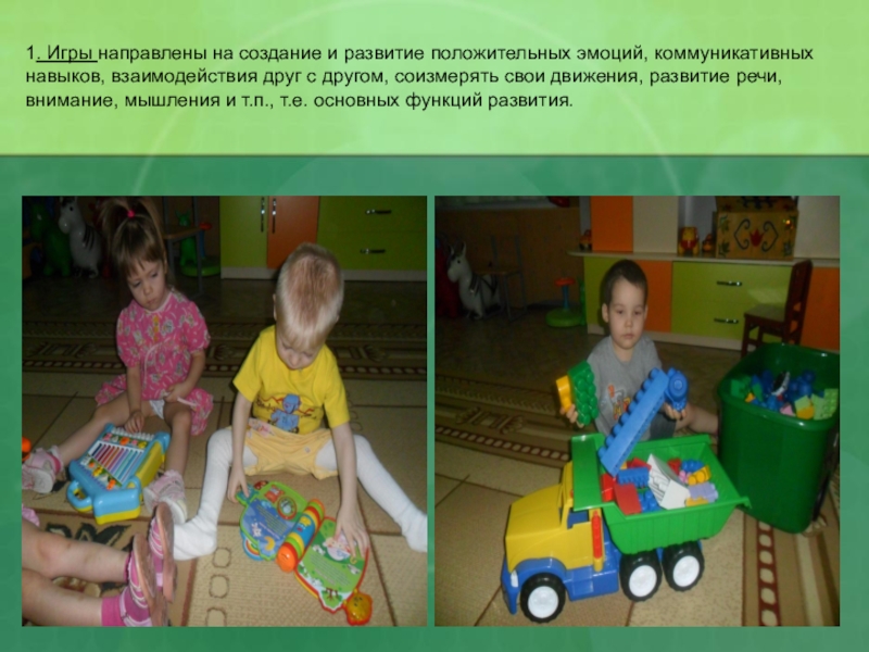 Слайд 71. Игры направлены на создание и развитие положительных эмоций, коммуникативных навыков,