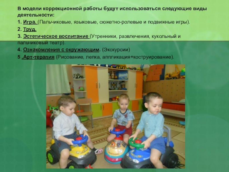 Слайд 6В модели коррекционной работы будут использоваться следующие виды деятельности: