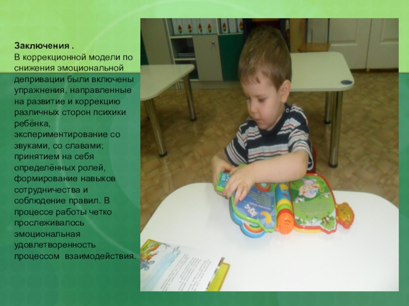 проявлений при взаимодействии, особенно с детьми раннего возраста, то это способствует меньшему риску возникновения эмоциональной депривации, которая отрицательно влияет на развитие личности в целом. Кроме того, модель коррекционной работы подразумевала решение поставленных нами задач в начале исследования не на отдельных занятиях, а включенность в повседневную жизнь детей в Доме ребёнка.