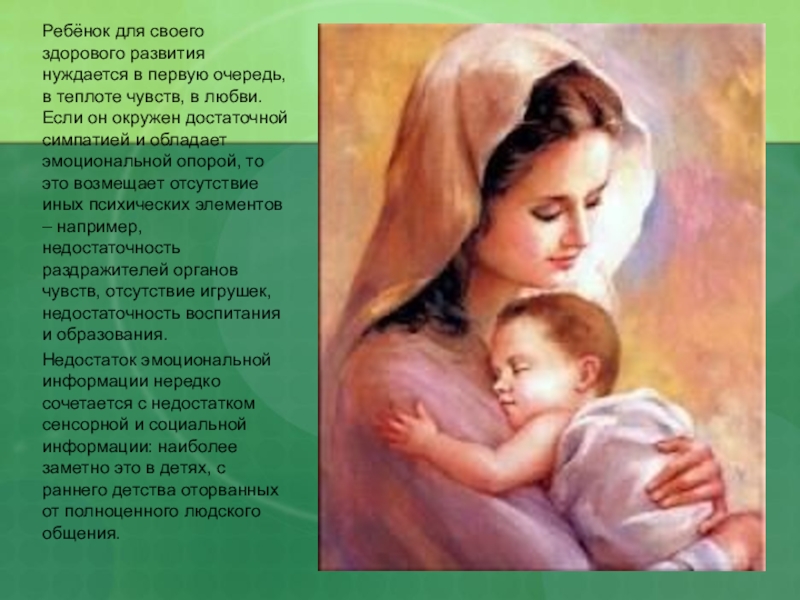 Слайд 2Ребёнок для своего здорового развития нуждается в первую очередь, в теплоте