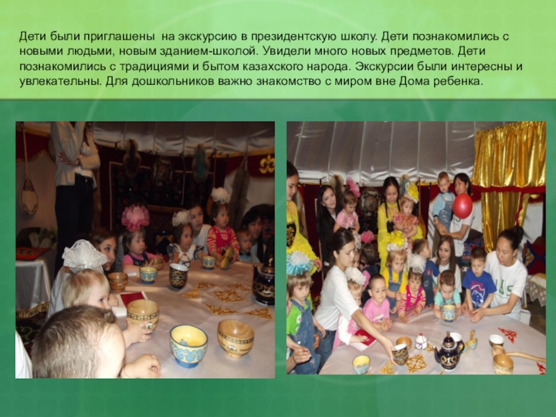 новыми людьми, новым зданием-школой. Увидели много новых предметов. Дети познакомились с традициями и бытом казахского народа. Экскурсии были интересны и увлекательны. Для дошкольников важно знакомство с миром вне Дома ребенка.