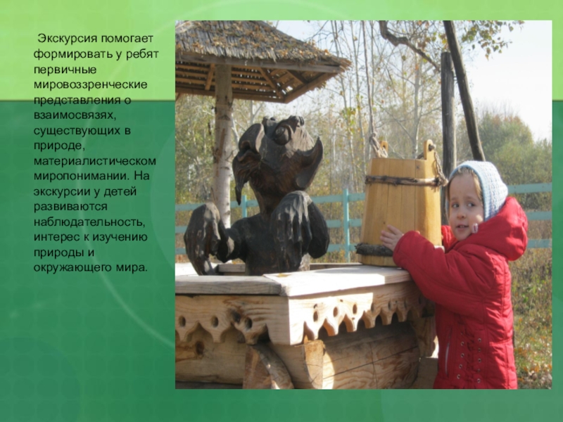 Слайд 18 Экскурсия помогает формировать у ребят первичные мировоззренческие представления о взаимосвязях,