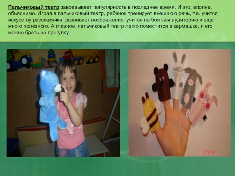 Слайд 16Пальчиковый театр завоевывает популярность в последнее время. И это, вполне, объяснимо. Играя