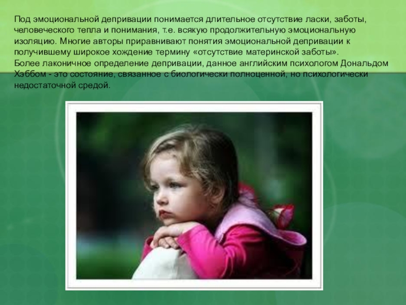 Слайд 3Под эмоциональной депривации понимается длительное отсутствие ласки, заботы, человеческого тепла и
