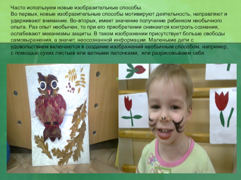 направляют и удерживают внимание. Во-вторых, имеет значение получение ребенком необычного опыта. Раз опыт необычен, то при его приобретении снижается контроль сознания, ослабевают механизмы защиты. В таком изображении присутствует больше свободы самовыражения, а значит, неосознанной информации. Маленькие дети с удовольствием включаются в создание изображений необычным способом, например, с помощью сухих листьев или ватными палочками, или разрисовываем себя.