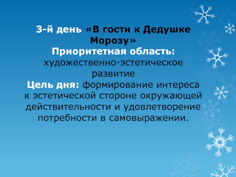 Слайд 6 3-й день «В гости к Дедушке Морозу» Приоритетная область: художественно-эстетическое развитие Цель дня: