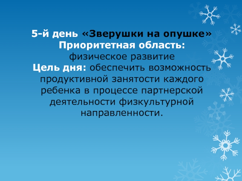 Слайд 8 5-й день «Зверушки на опушке» Приоритетная область: физическое развитие Цель дня: обеспечить возможность