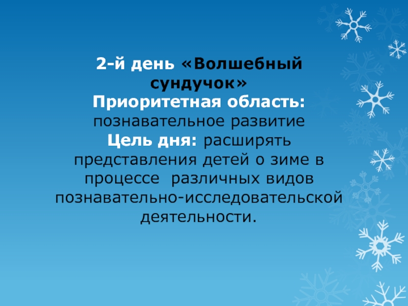 2-й день «Волшебный сундучок» Приоритетная область: познавательное развитие Цель дня: расширять представления детей о зиме в процессе