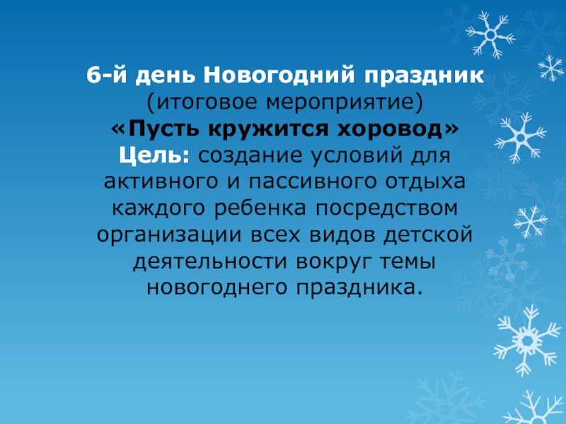 6-й день Новогодний праздник (итоговое мероприятие) «Пусть кружится хоровод» Цель: создание условий для активного и пассивного отдыха