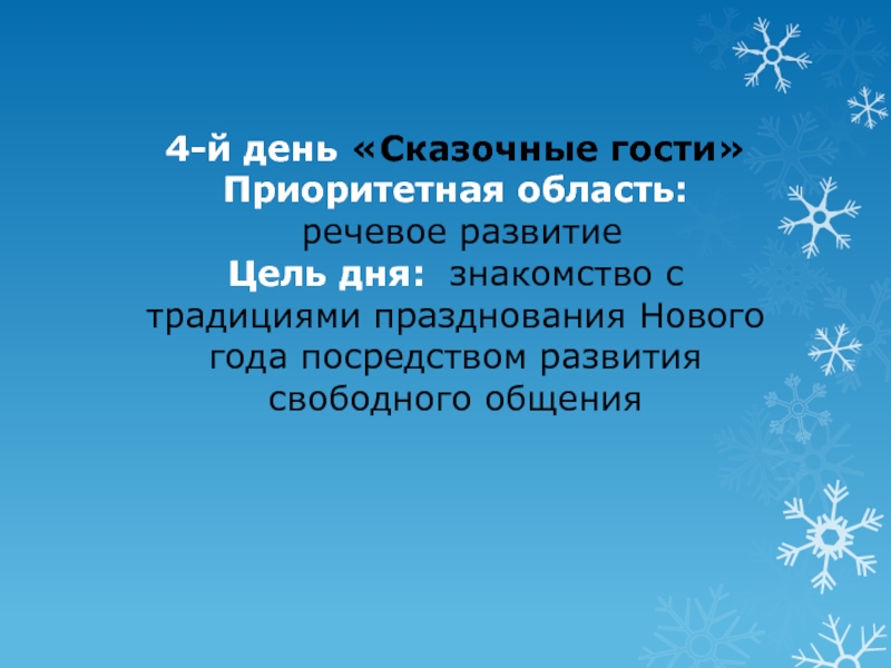 Слайд 7 4-й день «Сказочные гости» Приоритетная область: речевое развитие Цель дня: знакомство с