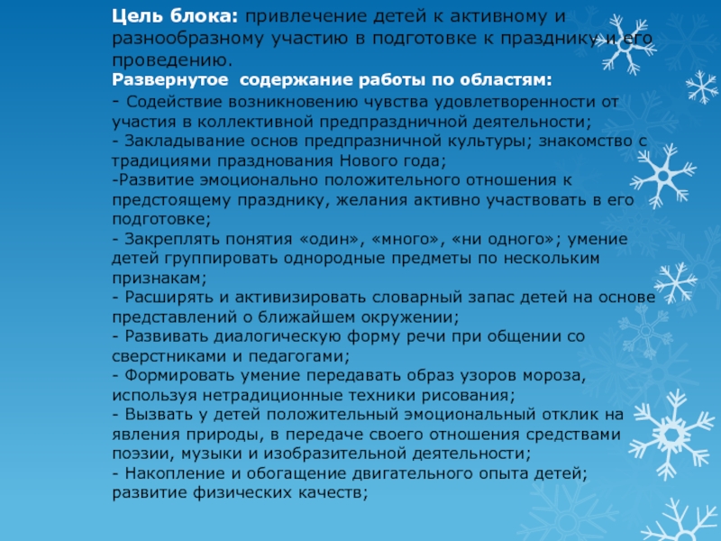 к празднику и его проведению. Развернутое содержание работы по областям: - Содействие возникновению чувства удовлетворенности от участия в коллективной предпраздничной деятельности; - Закладывание основ предпразничной культуры; знакомство с традициями празднования Нового года; -Развитие эмоционально положительного отношения к предстоящему празднику, желания активно участвовать в его подготовке; - Закреплять понятия «один», «много», «ни одного»; умение детей группировать однородные предметы по нескольким признакам; - Расширять и активизировать словарный запас детей на основе представлений о ближайшем окружении; - Развивать диалогическую форму речи при общении со сверстниками и педагогами; - Формировать умение передавать образ узоров мороза, используя нетрадиционные техники рисования; - Вызвать у детей положительный эмоциональный отклик на явления природы, в передаче своего отношения средствами поэзии, музыки и изобразительной деятельности; - Накопление и обогащение двигательного опыта детей; развитие физических качеств;