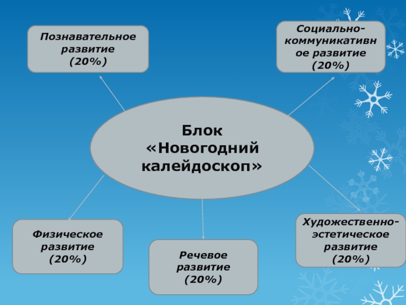 Блок«Новогодний калейдоскоп»Познавательное развитие(20%)Социально-коммуникативное развитие(20%)Физическое развитие(20%)Художественно-эстетическое развитие(20%)Речевое развитие(20%)