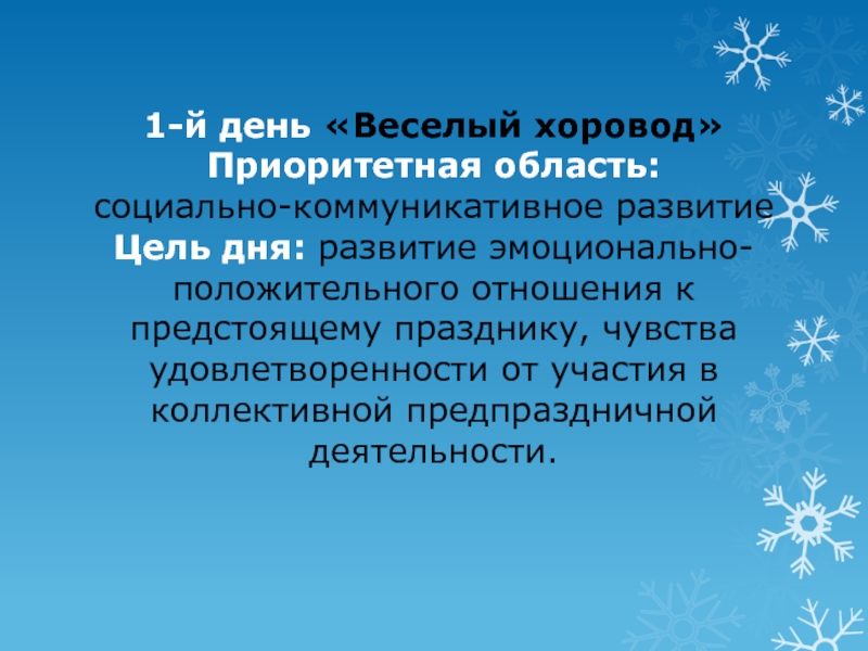 Слайд 4 1-й день «Веселый хоровод» Приоритетная область: социально-коммуникативное развитие Цель дня: развитие эмоционально-положительного отношения