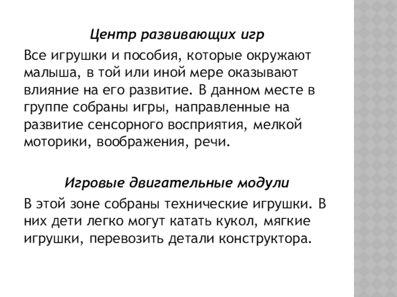 или иной мере оказывают влияние на его развитие. В данном месте в группе собраны игры, направленные на развитие сенсорного восприятия, мелкой моторики, воображения, речи.