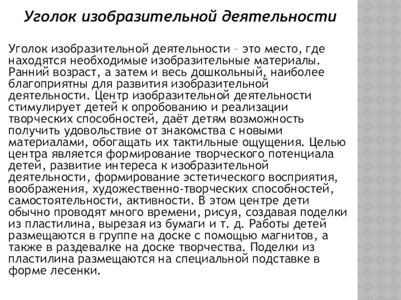 изобразительные материалы. Ранний возраст, а затем и весь дошкольный, наиболее благоприятны для развития изобразительной деятельности. Центр изобразительной деятельности стимулирует детей к опробованию и реализации творческих способностей, даёт детям возможность получить удовольствие от знакомства с новыми материалами, обогащать их тактильные ощущения. Целью центра является формирование творческого потенциала детей, развитие интереса к изобразительной деятельности, формирование эстетического восприятия, воображения, художественно-творческих способностей, самостоятельности, активности. В этом центре дети обычно проводят много времени, рисуя, создавая поделки из пластилина, вырезая из бумаги и т. д. Работы детей размещаются в группе на доске с помощью магнитов, а также в раздевалке на доске творчества. Поделки из пластилина размещаются на специальной подставке в форме лесенки.