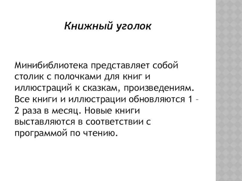 к сказкам, произведениям. Все книги и иллюстрации обновляются 1 – 2 раза в месяц. Новые книги выставляются в соответствии с программой по чтению.
