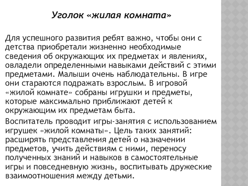 приобретали жизненно необходимые сведения об окружающих их предметах и явлениях, овладели определенными навыками действий с этими предметами. Малыши очень наблюдательны. В игре они стараются подражать взрослым. В игровой «жилой комнате» собраны игрушки и предметы, которые максимально приближают детей к окружающим их предметам быта.