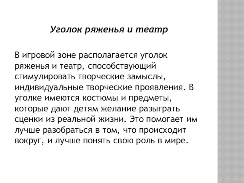 способствующий стимулировать творческие замыслы, индивидуальные творческие проявления. В уголке имеются костюмы и предметы, которые дают детям желание разыграть сценки из реальной жизни. Это помогает им лучше разобраться в том, что происходит вокруг, и лучше понять свою роль в мире.