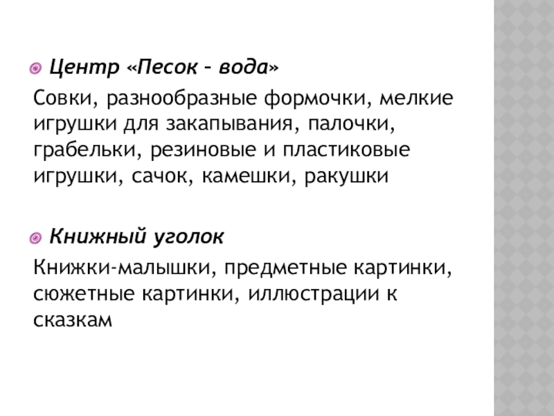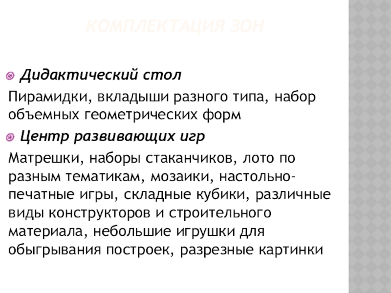 Матрешки, наборы стаканчиков, лото по разным тематикам, мозаики, настольно-печатные игры, складные кубики, различные виды конструкторов и строительного материала, небольшие игрушки для обыгрывания построек, разрезные картинки