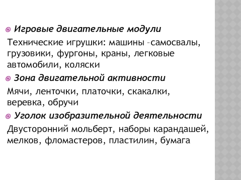 – потребности в движении является важной задачей при организации предметно-развивающей среды. Формирование зоны двигательной активности требует от воспитателей продуманного, грамотного подхода, так как необходимо выделить в группе место, которое бы позволяло детям свободно двигаться.