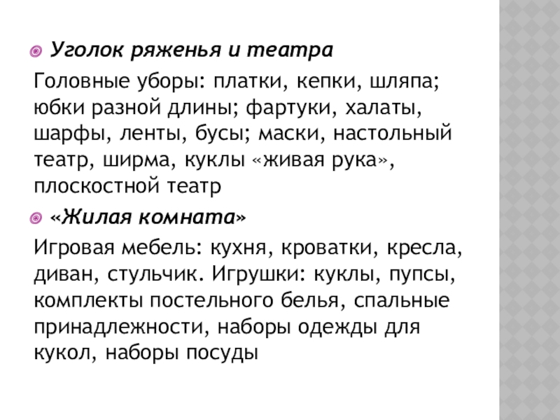 фартуки, халаты, шарфы, ленты, бусы; маски, настольный театр, ширма, куклы «живая рука», плоскостной театр