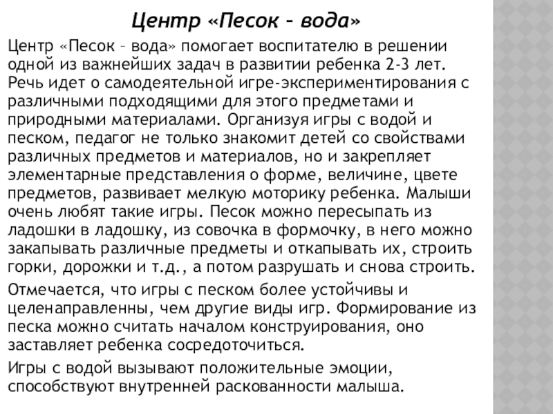 одной из важнейших задач в развитии ребенка 2-3 лет. Речь идет о самодеятельной игре-экспериментирования с различными подходящими для этого предметами и природными материалами. Организуя игры с водой и песком, педагог не только знакомит детей со свойствами различных предметов и материалов, но и закрепляет элементарные представления о форме, величине, цвете предметов, развивает мелкую моторику ребенка. Малыши очень любят такие игры. Песок можно пересыпать из ладошки в ладошку, из совочка в формочку, в него можно закапывать различные предметы и откапывать их, строить горки, дорожки и т.д., а потом разрушать и снова строить.