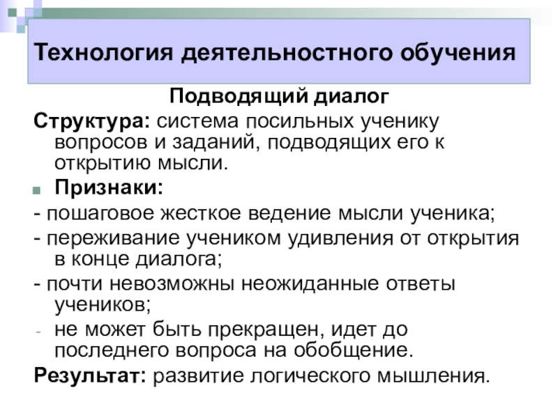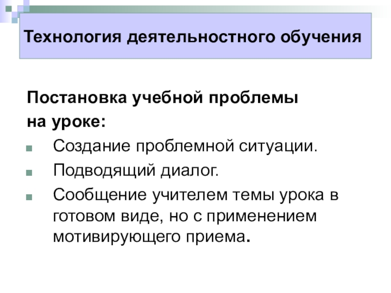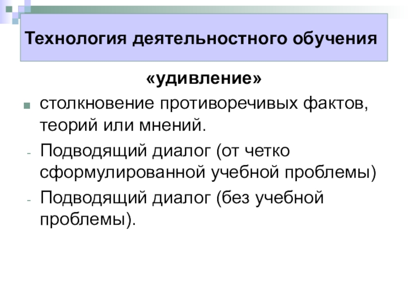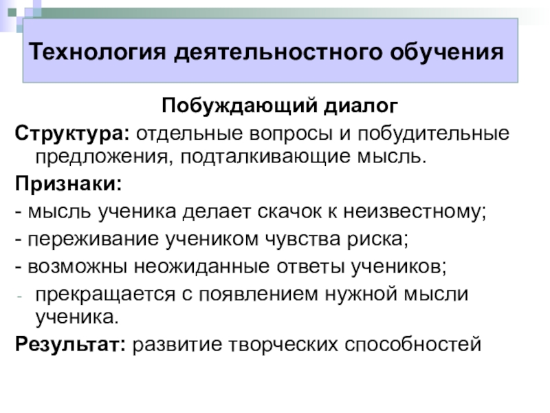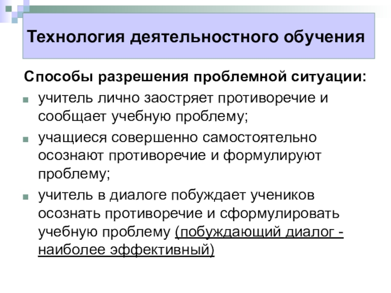учитель в диалоге побуждает учеников осознать противоречие и сформулировать учебную проблему (побуждающий диалог -наиболее эффективный)