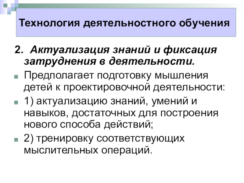 1) актуализацию знаний, умений и навыков, достаточных для построения нового способа действий;