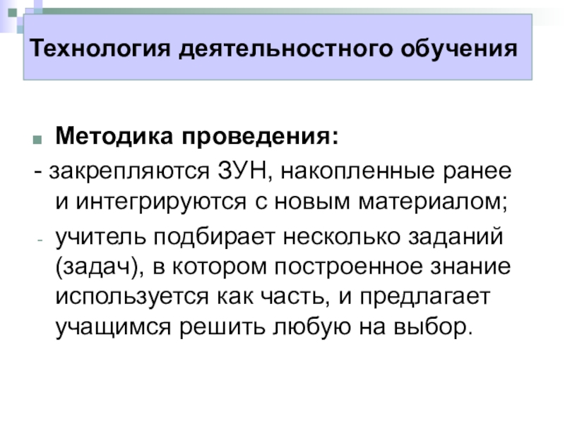 учитель подбирает несколько заданий (задач), в котором построенное знание используется как часть, и предлагает учащимся решить любую на выбор.