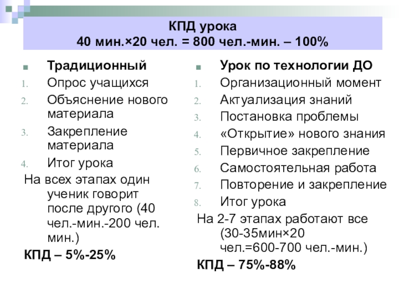 На всех этапах один ученик говорит после другого (40 чел.-мин.-200 чел.мин.)