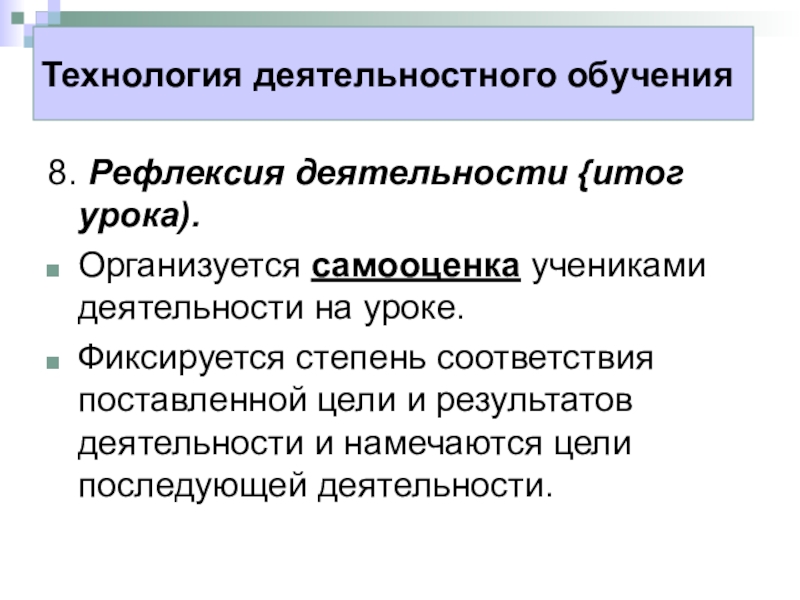 Фиксируется степень соответствия поставленной цели и результатов деятельности и намечаются цели последующей деятельности.