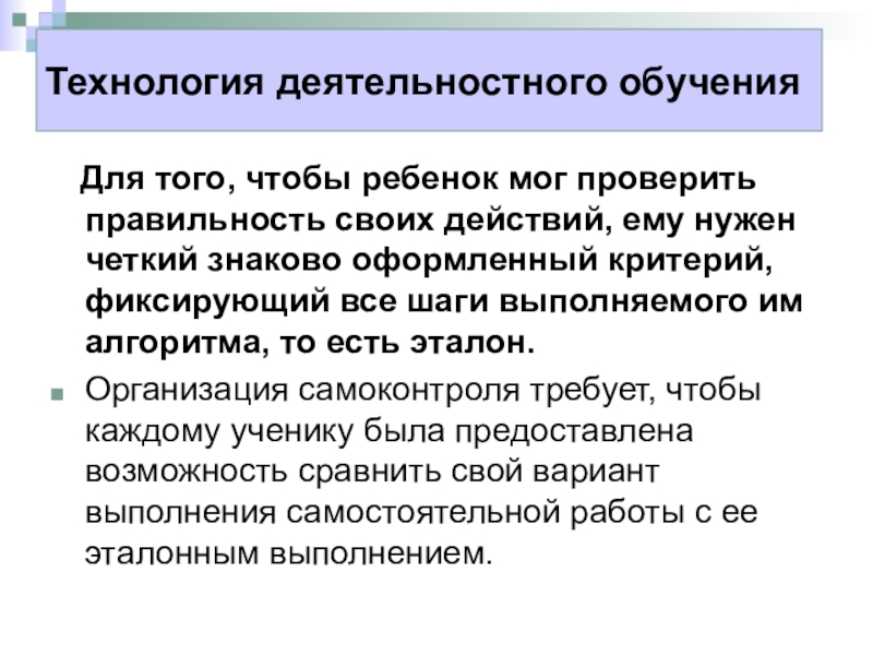 своих действий, ему нужен четкий знаково оформленный критерий, фиксирующий все шаги выполняемого им алгоритма, то есть эталон.