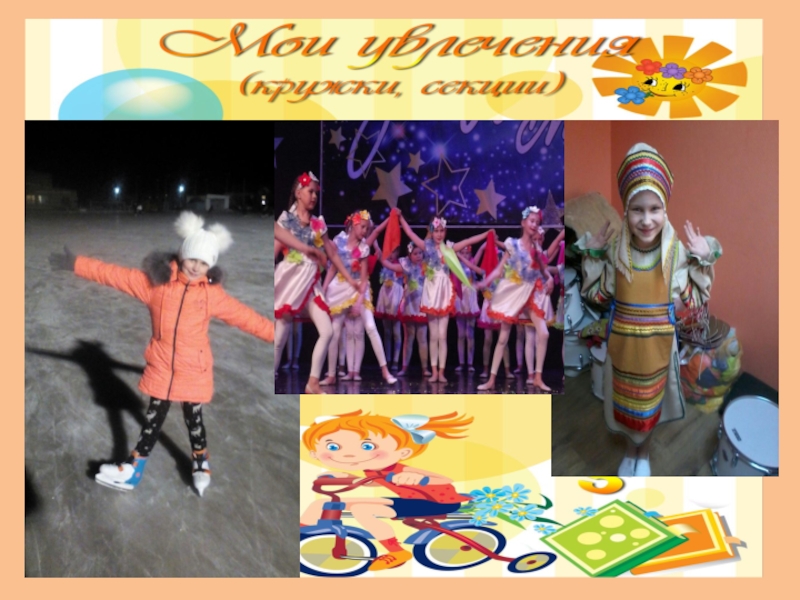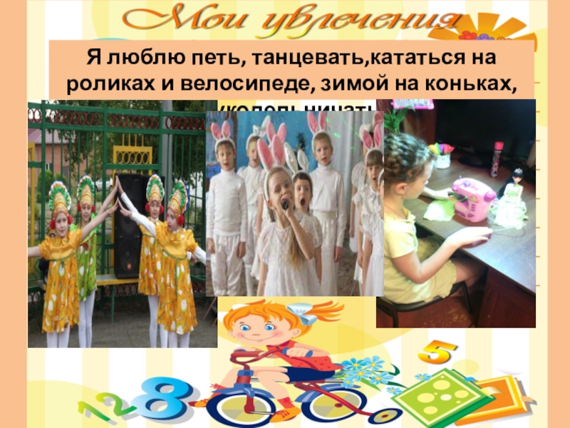 Я люблю петь, танцевать,кататься на роликах и велосипеде, зимой на коньках, рукодельничать.