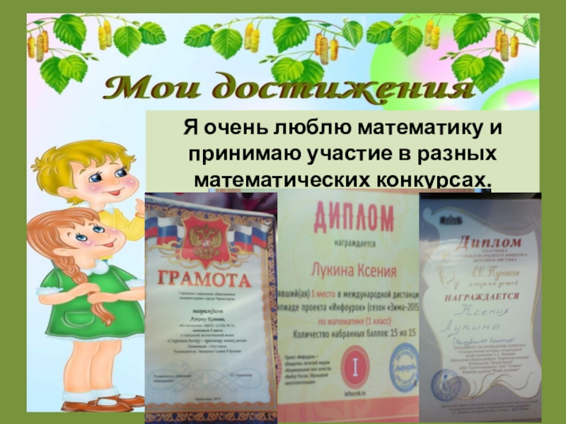Слайд 8Я очень люблю математику и принимаю участие в разных математических конкурсах.