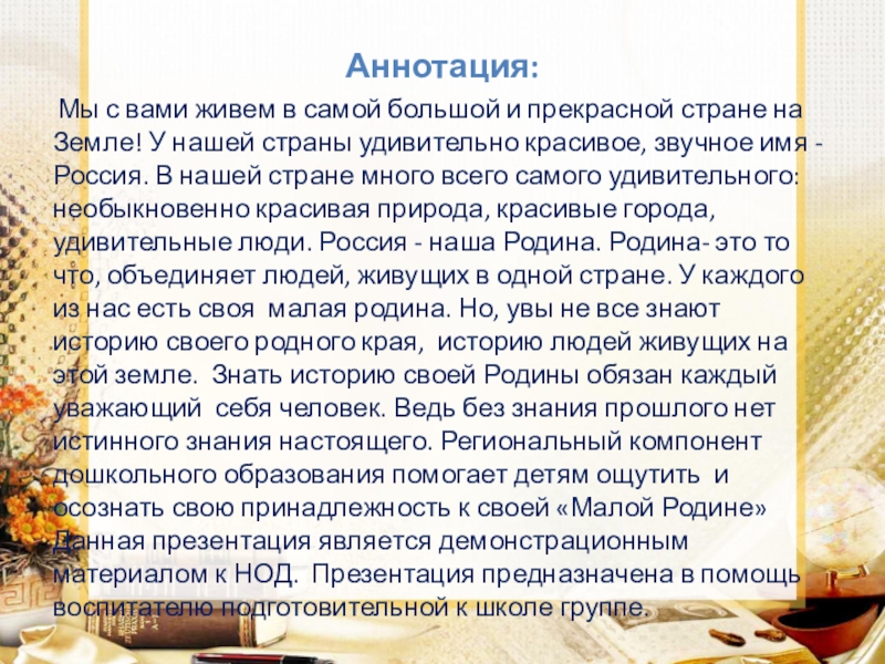 на Земле! У нашей страны удивительно красивое, звучное имя - Россия. В нашей стране много всего самого удивительного: необыкновенно красивая природа, красивые города, удивительные люди. Россия - наша Родина. Родина- это то что, объединяет людей, живущих в одной стране. У каждого из нас есть своя малая родина. Но, увы не все знают историю своего родного края, историю людей живущих на этой земле. Знать историю своей Родины обязан каждый уважающий себя человек. Ведь без знания прошлого нет истинного знания настоящего. Региональный компонент дошкольного образования помогает детям ощутить и осознать свою принадлежность к своей «Малой Родине» Данная презентация является демонстрационным материалом к НОД. Презентация предназначена в помощь воспитателю подготовительной к школе группе.