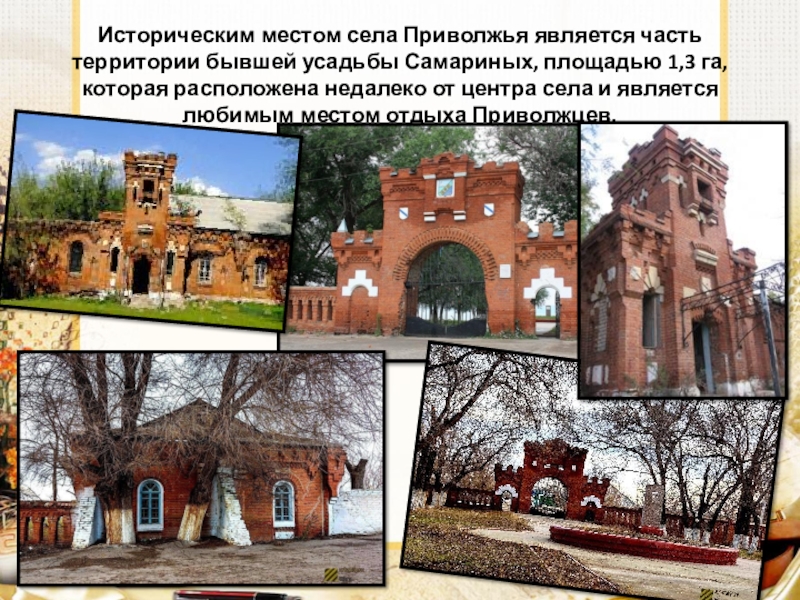Слайд 4Историческим местом села Приволжья является часть территории бывшей усадьбы Самариных, площадью