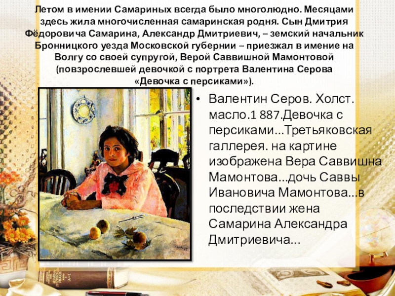 Валентин Серов. Холст.масло.1 887.Девочка с персиками...Третьяковская галлерея. на картине изображена Вера Саввишна Мамонтова...дочь Саввы Ивановича Мамонтова...в последствии жена Самарина Александра Дмитриевича...