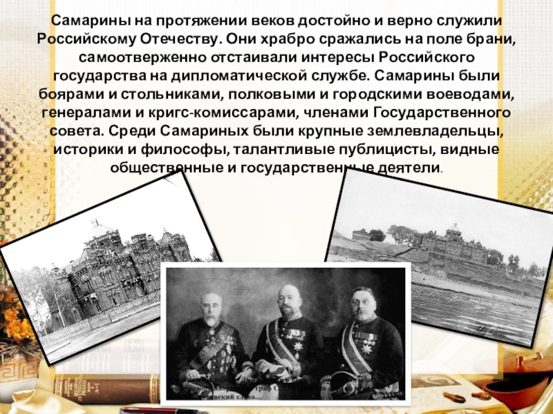 Слайд 14Самарины на протяжении веков достойно и верно служили Российскому Отечеству. Они