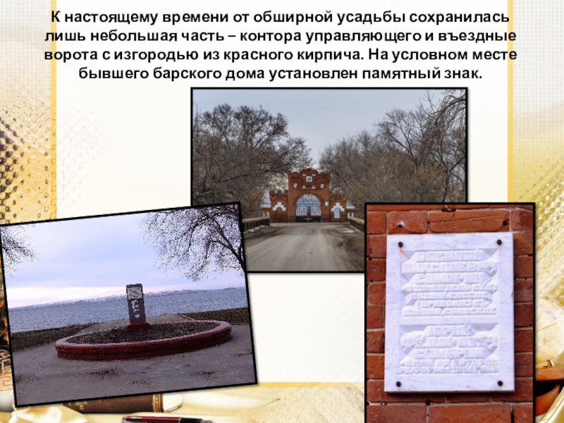 контора управляющего и въездные ворота с изгородью из красного кирпича. На условном месте бывшего барского дома установлен памятный знак.