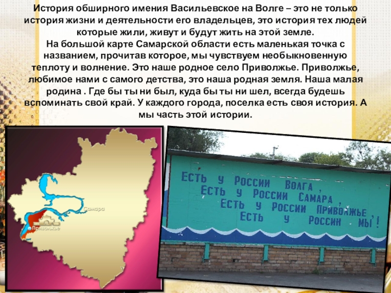 На большой карте Самарской области есть маленькая точка с названием, прочитав которое, мы чувствуем необыкновенную теплоту и волнение. Это наше родное село Приволжье. Приволжье, любимое нами с самого детства, это наша родная земля. Наша малая родина . Где бы ты ни был, куда бы ты ни шел, всегда будешь вспоминать свой край. У каждого города, поселка есть своя история. А мы часть этой истории.