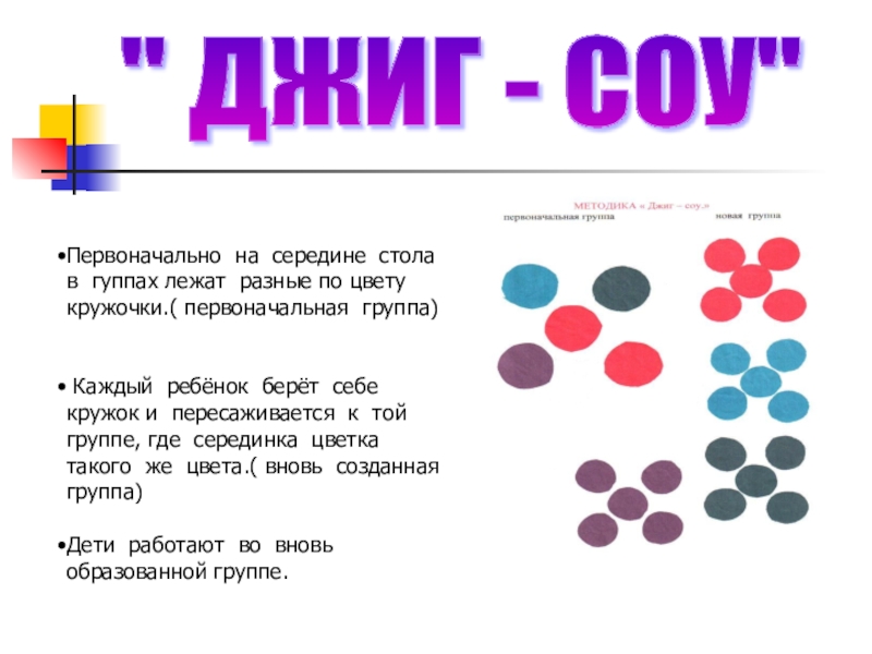 Первоначально на середине стола в гуппах лежат разные по цвету кружочки.( первоначальная группа)