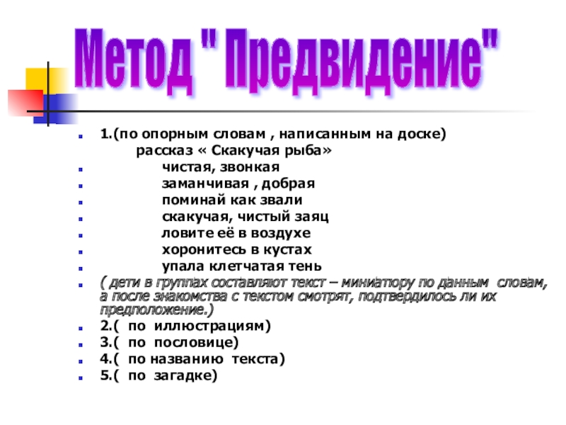 ( дети в группах составляют текст – миниатюру по данным словам, а после знакомства с текстом смотрят, подтвердилось ли их предположение.)