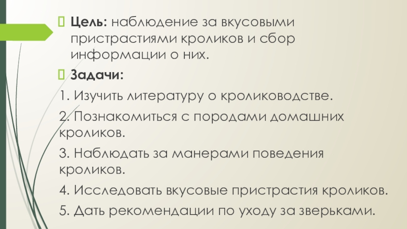 Слайд 3Цель: наблюдение за вкусовыми пристрастиями кроликов и сбор информации о них.