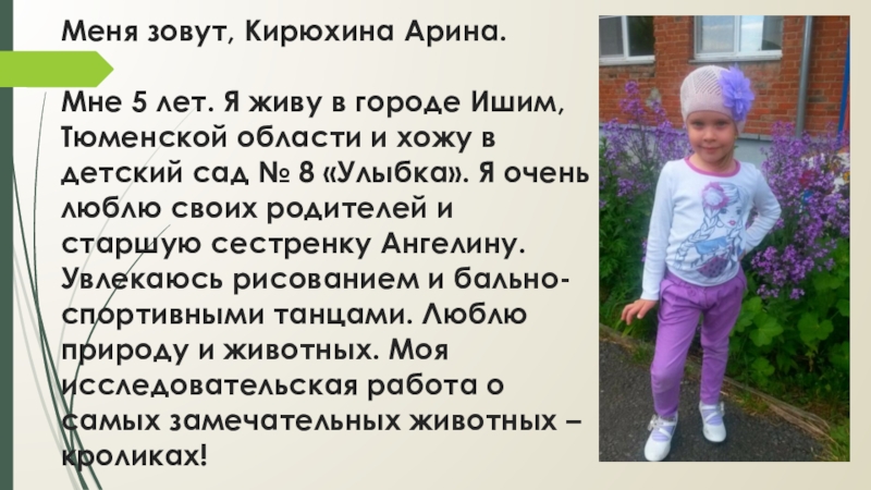 Тюменской области и хожу в детский сад № 8 «Улыбка». Я очень люблю своих родителей и старшую сестренку Ангелину. Увлекаюсь рисованием и бально-спортивными танцами. Люблю природу и животных. Моя исследовательская работа о самых замечательных животных – кроликах!